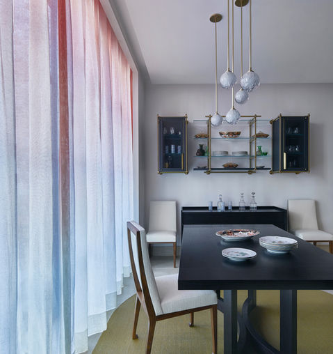 In this light-filled townhouse, we updated bathrooms and selected lighting, wall finishes, furnishings and decor. We created immersive children and tween bedroom designs complete with a curved bookcase with hidden hangout and netted suspended hammock, a whimsical townhouse bed with play space and ramp to a reading nook perch, and a tree-shaped bookcase and swinging chair. The interactive play space with climbing walls, monkey bars, foam pit and zip line as designed through Smart Playrooms.
