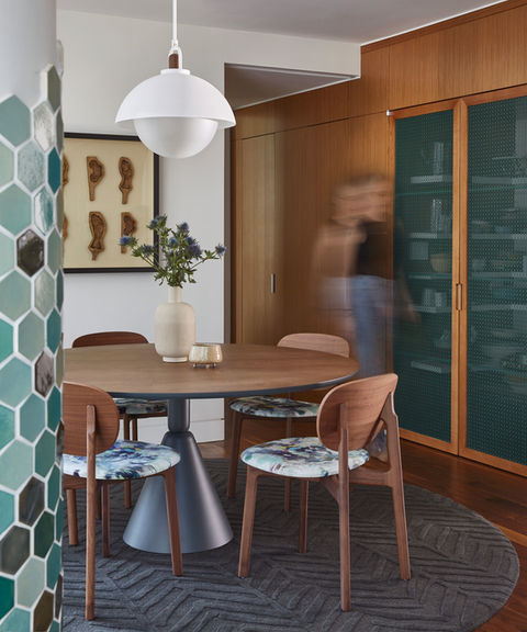 In this modern, window-filled duplex, we added plenty of warm textures like wood finishes and a unique tile application. Our firm provided turn-key design and management of furniture, rugs, decorative light fixtures, and decorative wall finish selections of the full home. We added decorative tile to the kitchen and fireplace, and designed millwork and functional kitchen cabinet designs.